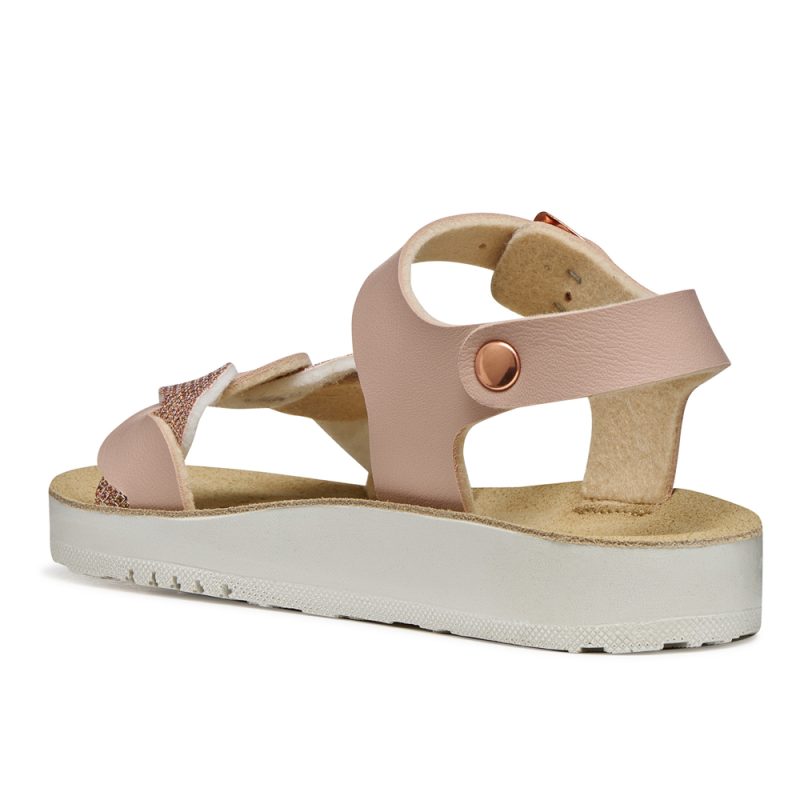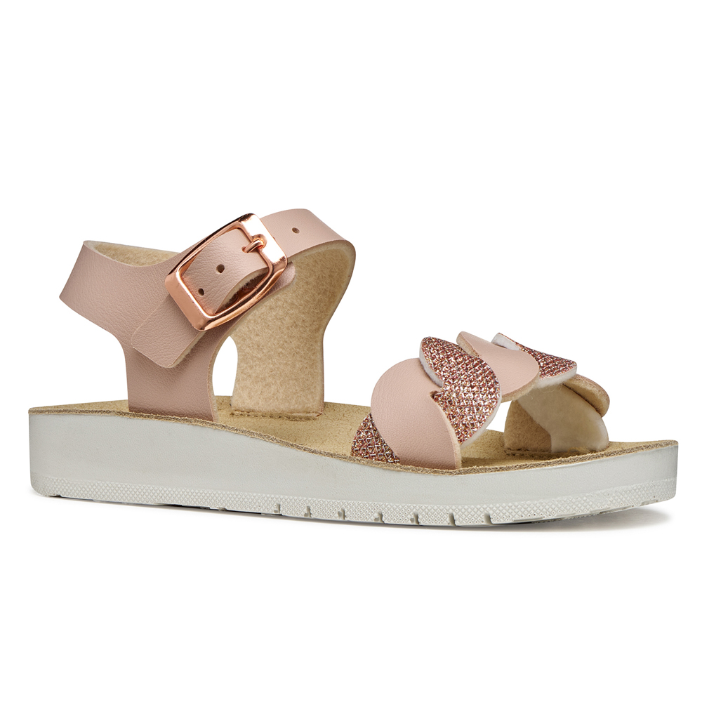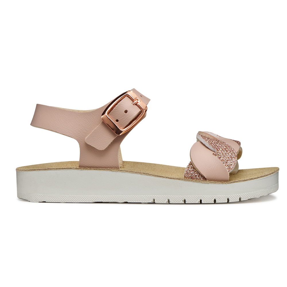 Geox sandal with adjustable clasp. It features a decoration on the front. The inner part consists of leather and a leather,anatomic,antibacterial insole. The outsole consists of rubber.