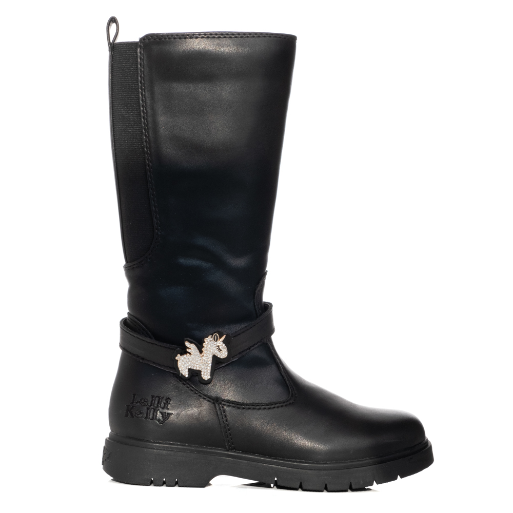 Lelli Kelly boot with zipper.It features a unicorn strap.The inner part of the shoe consists of textile and a leather insole.The outsole consists of rubber.