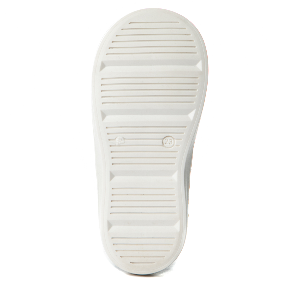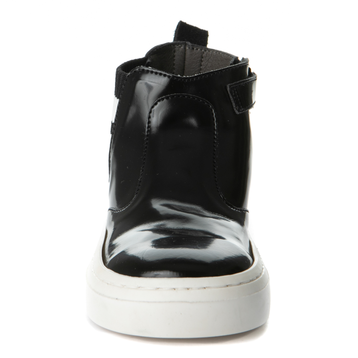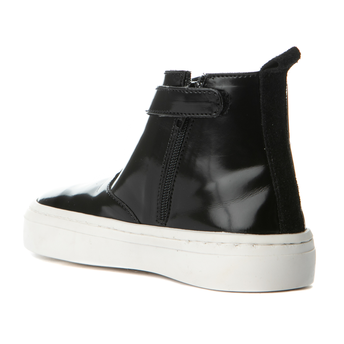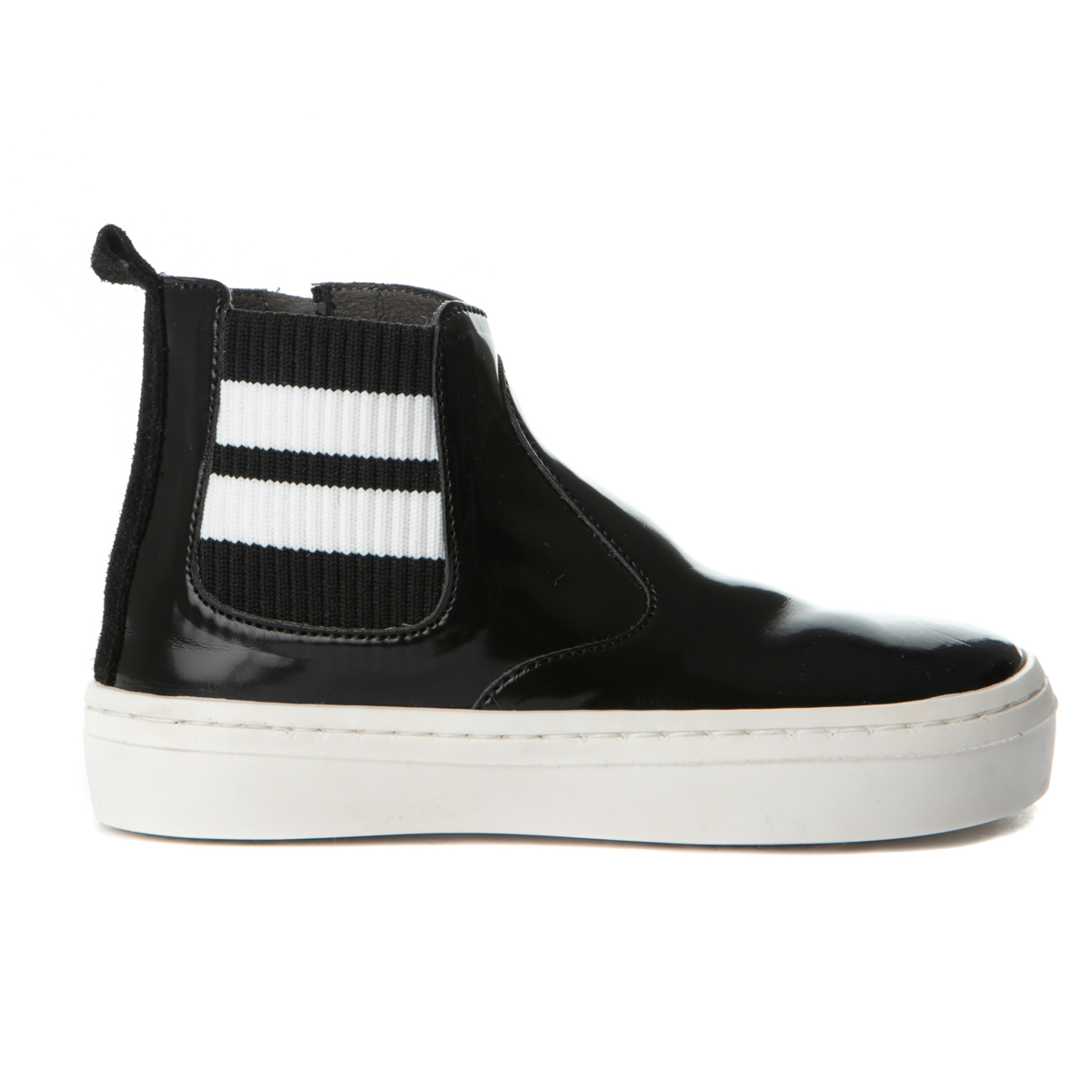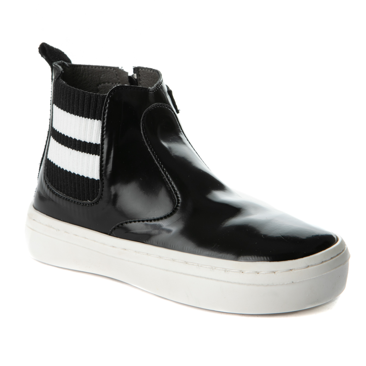 Babywalker boot with zipper on the side. This boot features a round front end and two white stripes on the side. The inner part of this shoe consists of leather and a leather, anatomic, antibaterial, removable insole. The out sole is rubber.